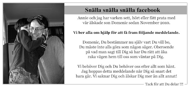 Hur mår vår Domenic i dag, INTE EN ENDA ANING!!! Inte ens hur han ser ut... Jag har gjort allt för att vi skall få en enda lucka, men det satte man stopp för, speciellt åklagare som inte har en enda aning om fallet, samt vägrar att gå igenom den information jag skickat.